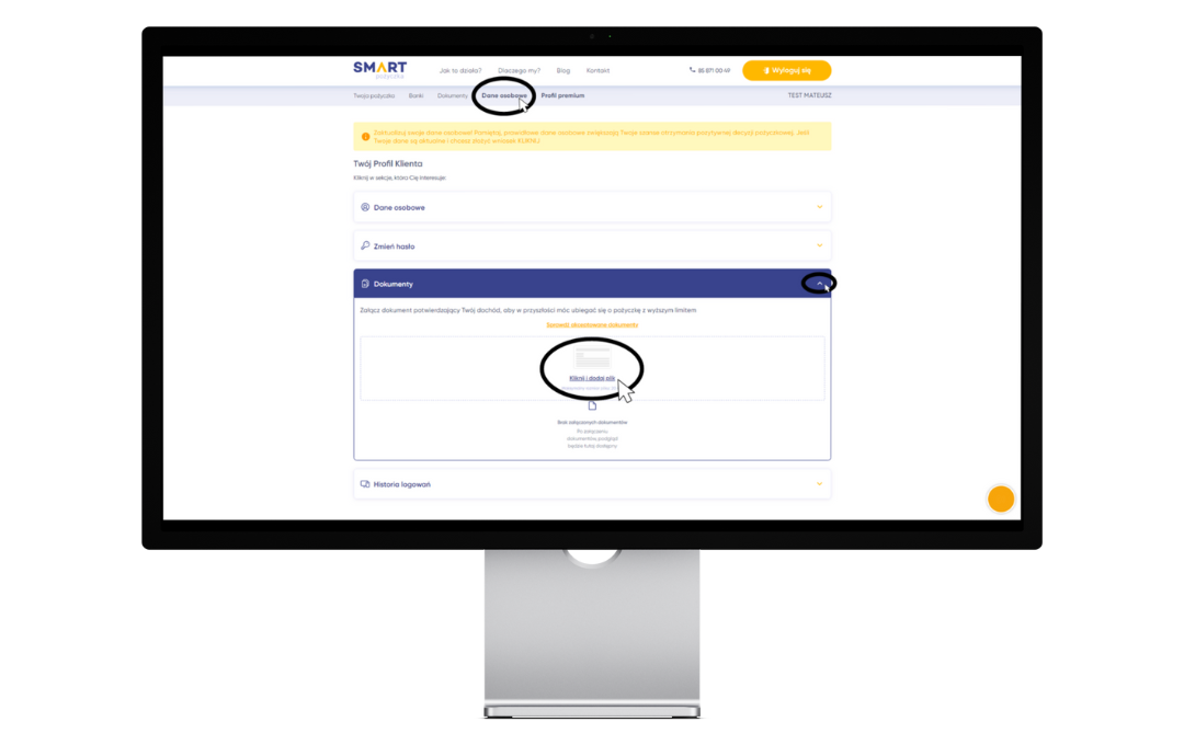 UWAGA! Dokumenty potwierdzające wysokość Twoich dochodów możesz załączyć jeszcze przed złożeniem wniosku o pożyczkę w wyższej kwocie, dzięki czemu w przyszłości proces aplikacji przebiegnie sprawniej. Możesz to zrobić logując się do swojego profilu w strefie klienta i wchodząc w zakładkę “Dane osobowe”. Dodanie dokumentu jest bardzo proste zarówno na telefonie, jak i na komputerze.